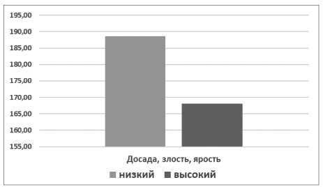 По уровню способности к децентрации различаются статистически значимо эмоции по всем ситуациям вместе, по группе: досада, злость, ярость (p=0,022). На основании данных можем сделать следующие выводы: люди, имеющие низкий уровень способности к децентрации в целом, чаще оценивают ситуации кибербуллинга через эмоции: досада, злость, ярость, чем люди с высоким уровнем способности к децентрации (рис.7).