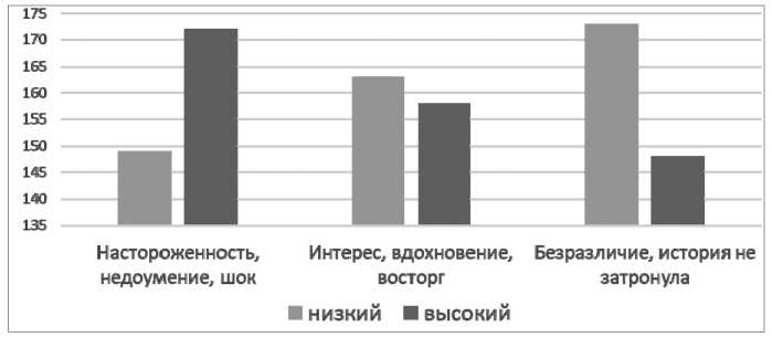 Люди, имеющие низкий уровень чувствительности к близким в целом, чаще оценивают ситуации кибербуллинга через эмоции: интерес, вдохновение, восторг и безразличие, история не затронула, чем люди с высоким уровнем чувствительности к близким.
