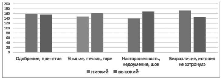 По уровню отзеркаливания эмоций различаются статистически значимо эмоции по всем ситуациям вместе, по группам: одобрение, принятие (p=0,037); настороженность, недоумение, шок (p=0,001); безразличие, история не затронула (p=0,000); уныние, печаль, горе на уровне тенденции (p=0,054) (рис. 10). Люди, имеющие низкий уровень отзеркаливания эмоций в целом, чаще оценивают ситуации кибербуллинга через эмоции: одобрение, принятие и безразличие, история не затронула, чем люди с высоким уровнем отзеркаливания эмоций. Люди, имеющие высокий уровень отзеркаливания эмоций в целом, чаще оценивают ситуации кибербуллинга через эмоции: уныние, печаль, горе на уровне тенденции и настороженность, недоумение, шок, чем люди с низким уровнем отзеркаливания эмоций.