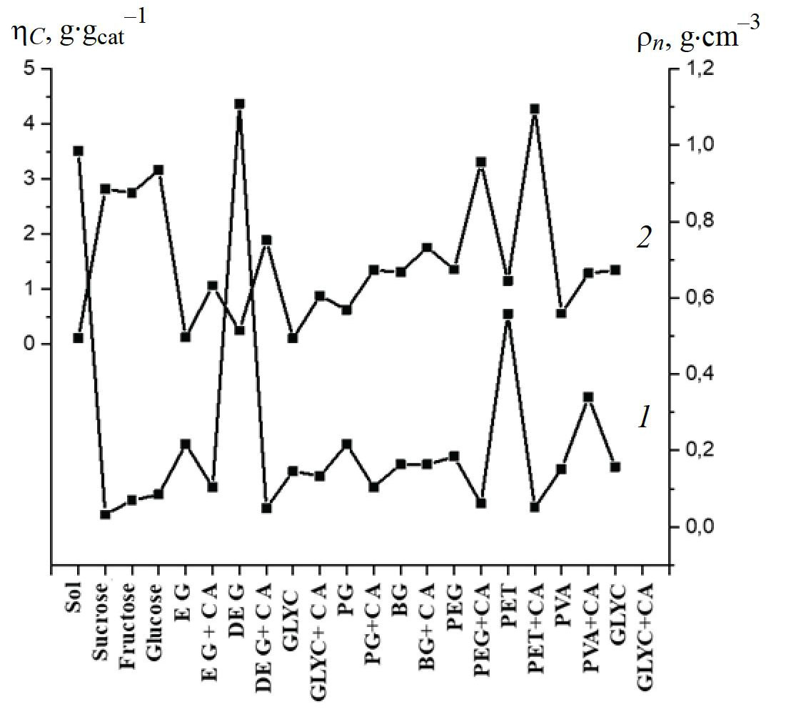 Metaloxide catalysts (MOCs–PCP) of the general composition Мe2Co / CaCO3 (СаО, МgО, NаСl, Ме – Fe, Ni) with a molar ratio Мe, Co / carrier equal to 0.12 : 1 were prepared by the PCP method using nitrates of crystalline metal hydrates Fe3+, Со2+, Ni2+, Са2+, Mg2+, sodium chloride; chelating agents – sucrose, fructose, glucose, ethylene glycol (EG), pure; diethylene glycol (DEG), pure; glycerol (GLY), pure; 1,2 – propylene glycol (PG), pure; 1,4 – butylene glycol (BG), pure; polyethylene glycol (PEG); polyvinyl alcohol (PVA), pure; pentaerythritol (PET), pure; food gradecitric acid (CA); glycine (GLYC), pure; and distilled water. MOCs-PCP obtained using two chelating agents, one of which is citric acid, are designated EG + CA, DEG + CA, GLY + CA, PG + CA, BG + CA, PVS + CA, PET + CA, GLYC + CA.