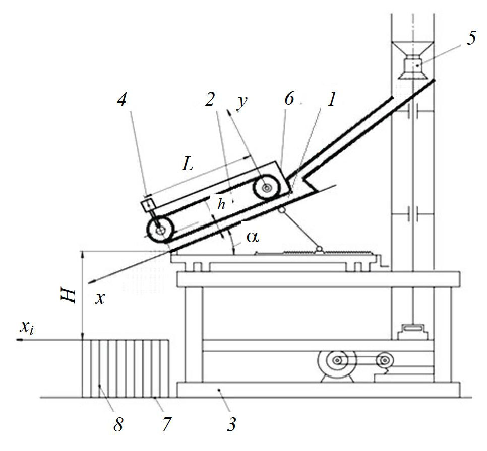 Fig. 2. Scheme of the experimental unit: 1 – rectangular channel with a rough bottom; 2 – conveyor with a rough belt; 3 – frame; 4 – conveyor drive; 5 – feeder dispenser; 6 – reflector; 7 – cuvette; 8 – cuvette cells