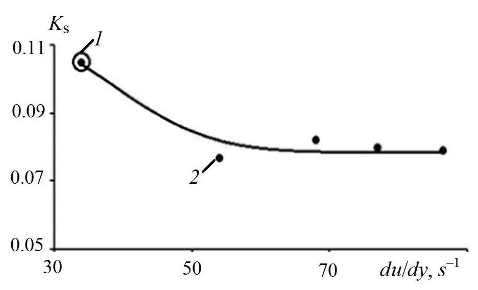 The findings on the impact of the intensity of momentum action on the efficiency of particle separation by density in the gravity flow are presented in Fig. 9 in the form of a dependence of the separation coefficient (8) on the shear rate. The technique for determining the average shear rate and separation coefficient was similar to the technique used in the case of differences in particle size. For a comparative assessment of the effect of momentum action in the separation process, the dependence Ks(du/dy) was constructed taking into account the separation coefficient and the average value of the shear rate in the gravity flow without momentum action. These indicators are determined in full accordance with the procedure used to find them in the gravity flow of particles of various sizes (Fig. 4).