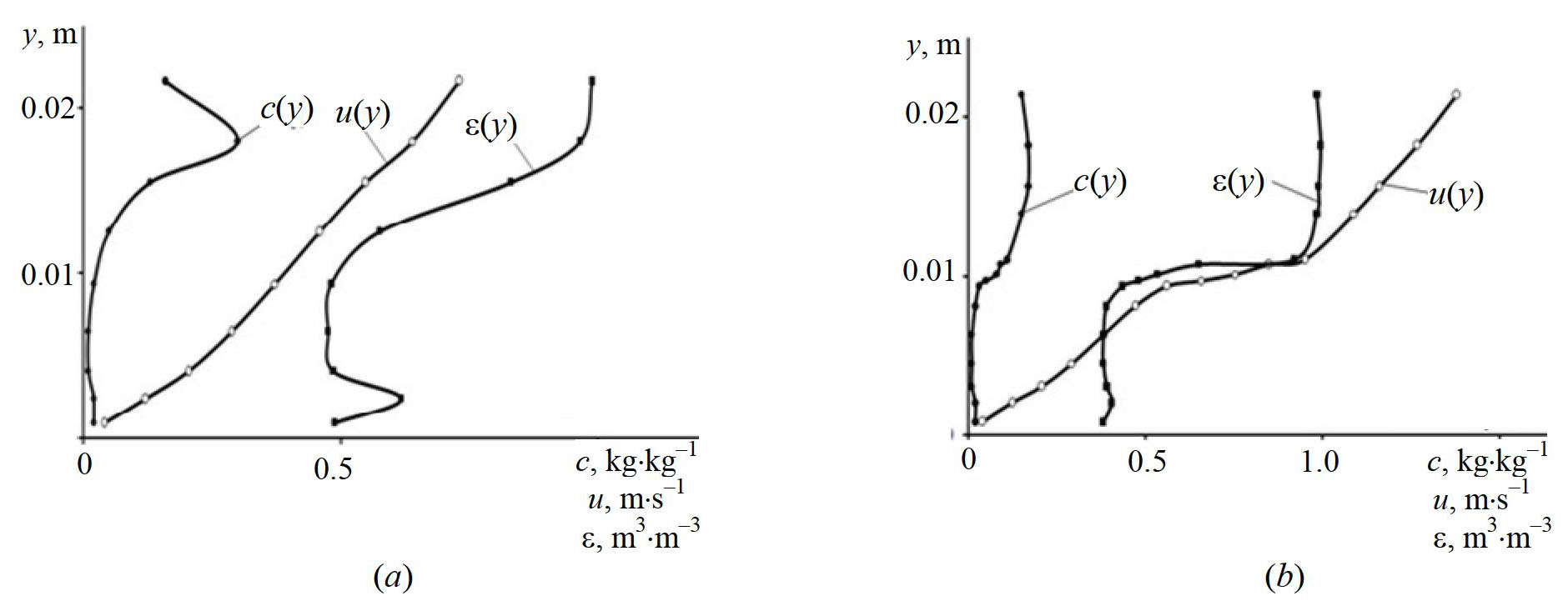 The results of the study in the form of profiles of velocity, volume fraction of voids and concentration of control particles (silica gel) in gravity flows without additional momentum action and in the case of its activation (belt speed 1.5 m×s–1) are shown in Figs. 5a and 5b, respectively.
