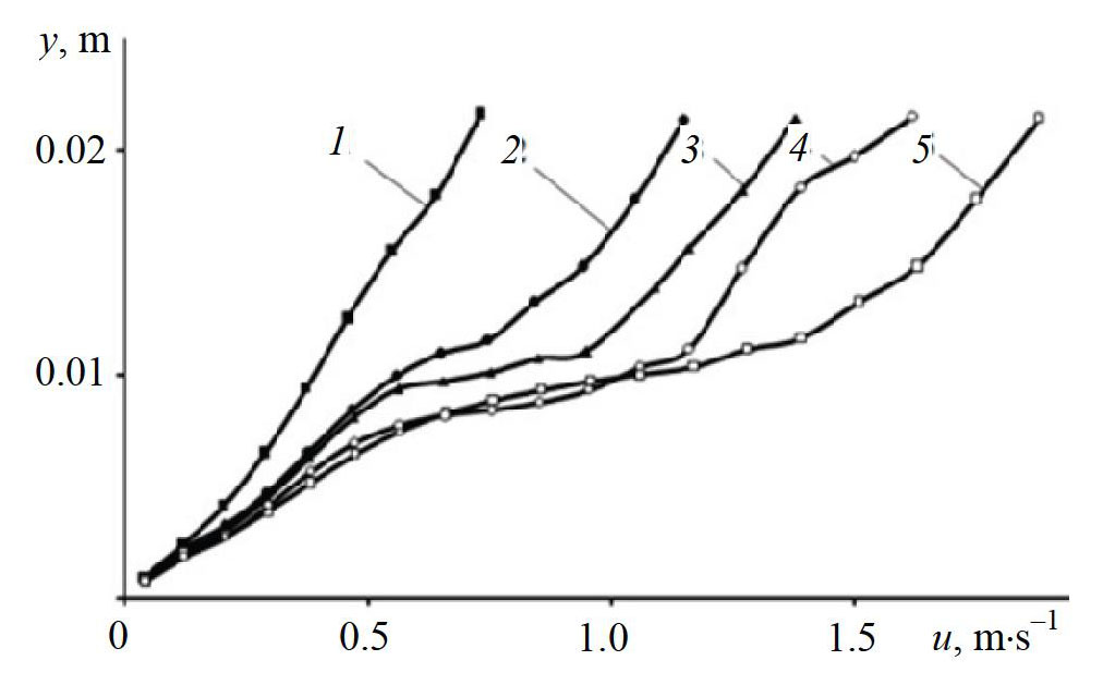 Fig. 6. Velocity profiles in gravity flows of a mixture of monodisperse particles (+3.6–3.75 mm) of beads and silica gel for different values of longitudinal momentum generated at conveyor belt speeds, m×s–1: 1 – 0.0; 2 – 1.2; 3 – 1.5; 4 – 1.7; 5 – 1.9