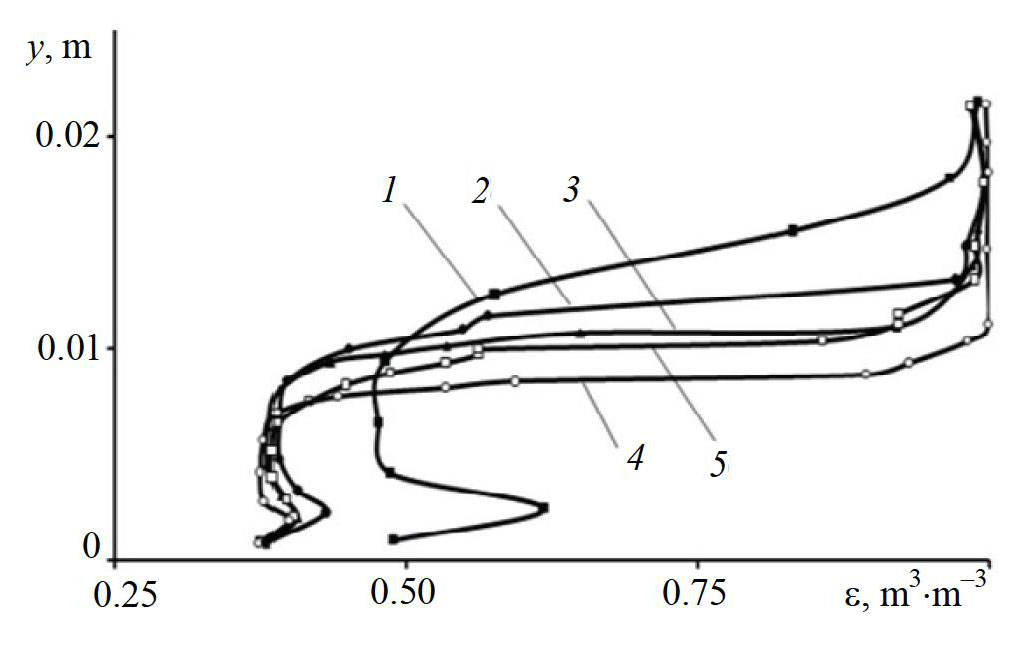 Fig. 7. Profiles of the volume fraction of voids in gravity flows of a mixture of monodisperse particles (+3.6–3.75 mm) of beads and silica gel for different values of longitudinal momentum generated at conveyor belt speeds, m×s–1: 1 – 0.0; 2 – 1.2; 3 – 1.5; 4 – 1.7; 5 – 1.9