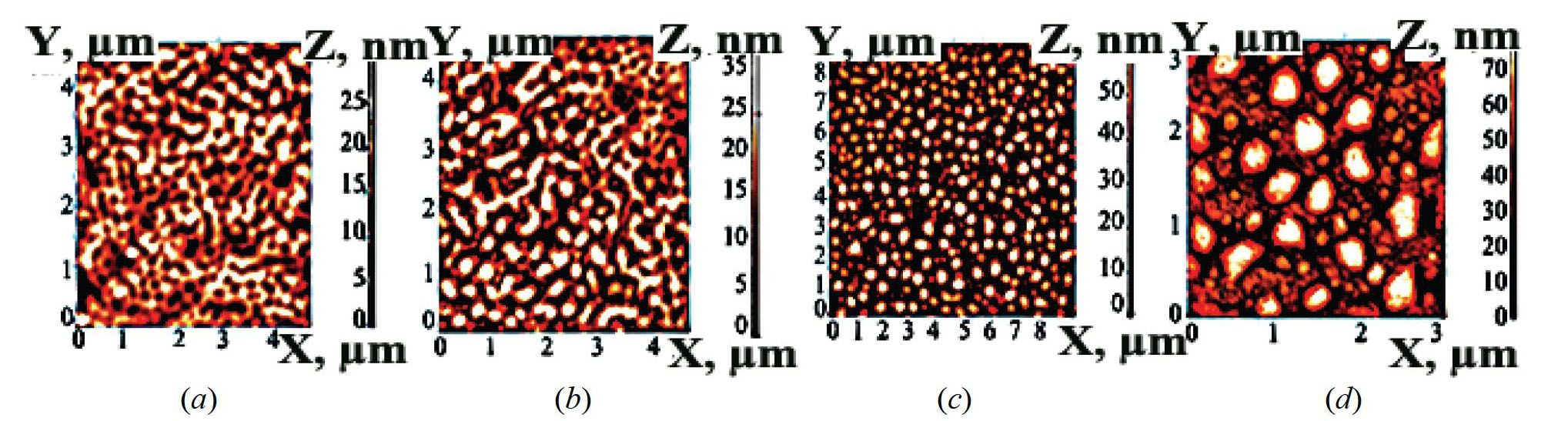 Fig. 3. AFM images of PbTe cluster structures: samples with dendritic (a, b) and percolation (c, d) reliefs