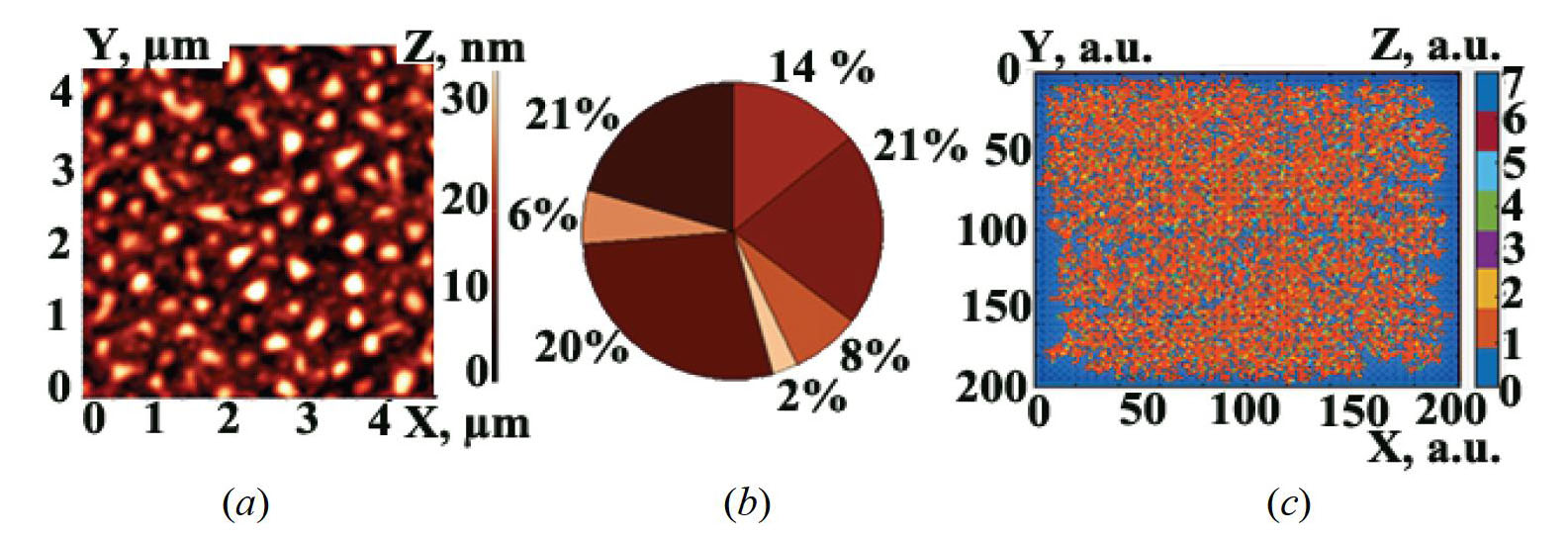 Standard fractal models, for example, such as DLA, in the case of constructing a horizontal projection, do not allow taking into account the heterogeneity of the relief of the model system of nanoclusters in height. This limitation can be avoided by labeling the model cells according to the height of the actual granules in AFM images. Such labeling can be done using cluster analysis for different bead colors corresponding to different heights for AFM images. This procedure was implemented using the K-means algorithm in the MATLAB environment [45–48]. Thus, the model particles received height values with given probabilities proportional to the sizes of the formed granules. Figure 5 shows a cluster film model obtained according to the above approach. In this case, Fig. 5a shows a sample of a PbTe film; Fig. 5b shows the distribution of heights as a result of clustering; and Fig. 5c shows the model structure of the cluster system built in the DLA approximation, taking into account the color marking of the relative heights of the forming granules. Thus, the specified structure was built with the probability of aggregation/adhesion s = 0.1. This probability s determines the process of agglomeration of nanoparticles into the corresponding ensembles. The fractal dimension was D = 1.89 and differed from the dimension of the sample as a whole by an amount of the order of 2×10–2.