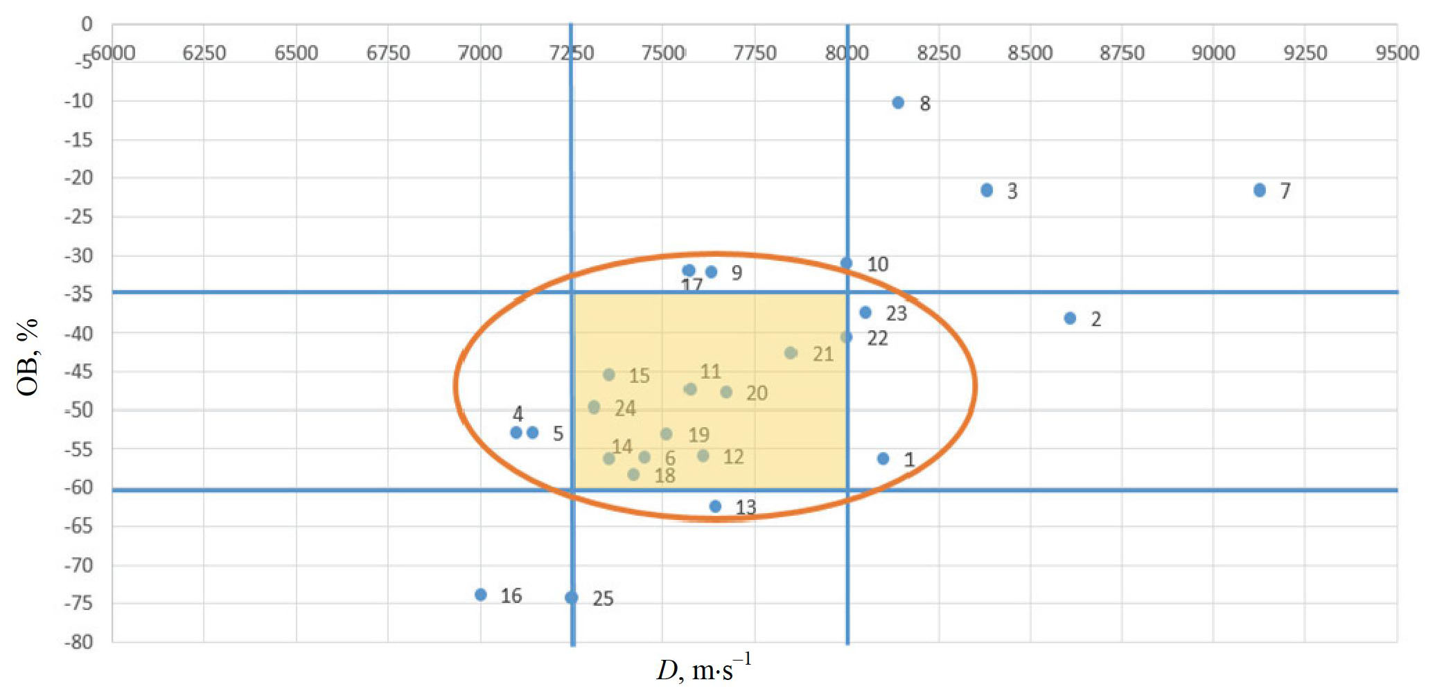 However, tabular material is difficult to perceive without graphical representation. In Fig. 1, in the coordinates of detonation velocity to OB, the region bounded by oxygen balance –35÷–60 % and optimum D = 7250–8000 m×s–1 is highlighted.