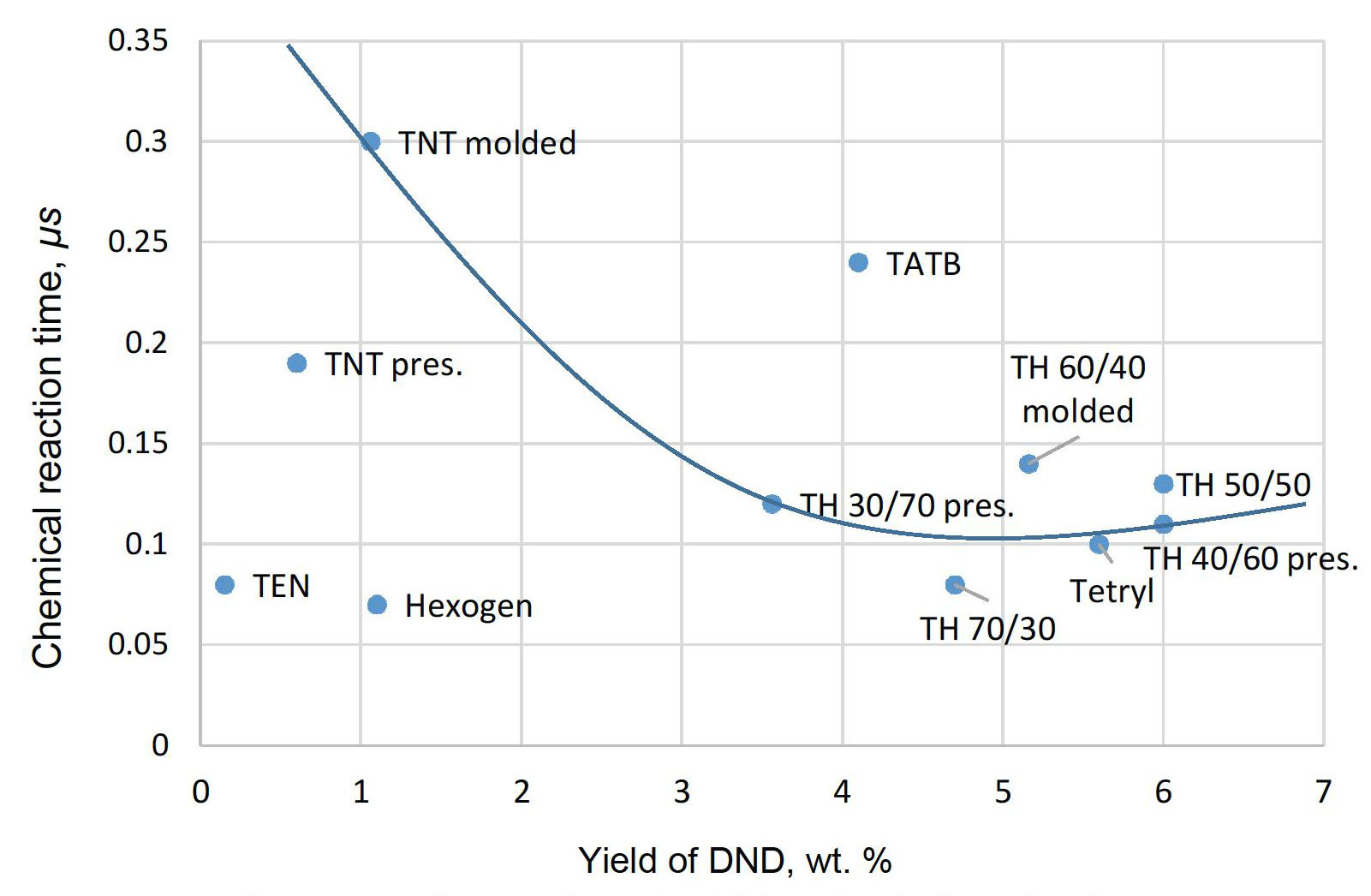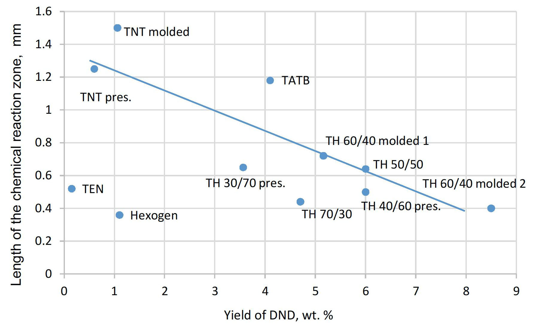 All explosives inside this region (as well as those lying immediately beyond it) are likely to provide an acceptable yield of DND (≥ 5 wt. %). These new initial explosives can include: hexyl (hexanitrodiphenylamine), hexanitrodiphenyl, tetranitroaniline, tetranitrobenzene, trinitroaniline, trinitroanisole, 1,3-diamino-2,4,6-trinitrobenzene, trinitrobenzene and their mixtures, i.e. polynitroaromatic compounds. The dependences obtained below with a high degree of probability can be extended only to powerful polyaromatic explosives. In addition, the value of DND yield obtained under different conditions for one and the same type of explosives can significantly differ from each other for different researchers.