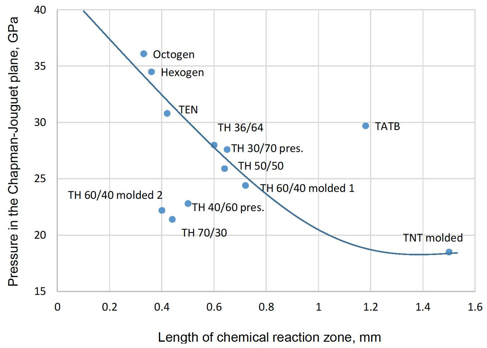 The CRZ length (mm) is related to the pressure in the Chapman-Jouguet plane (P, GPa), by the following dependence L = –5.84 + 770/(P + 93.8).