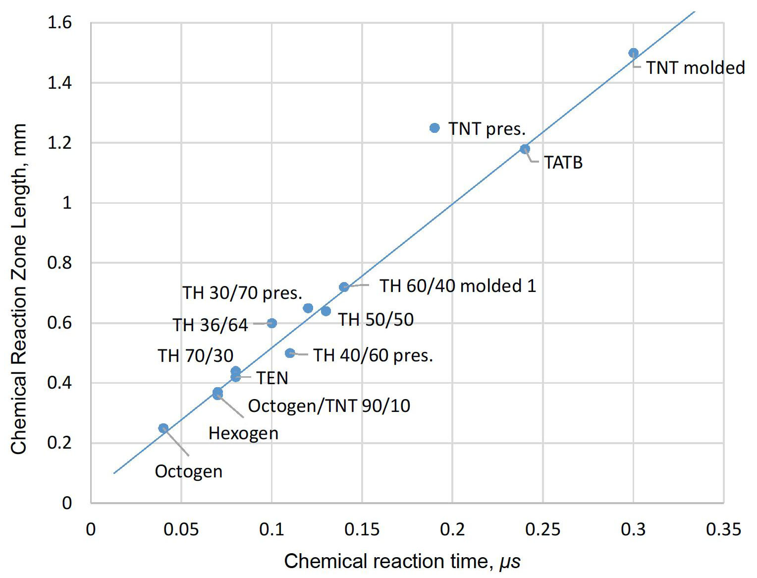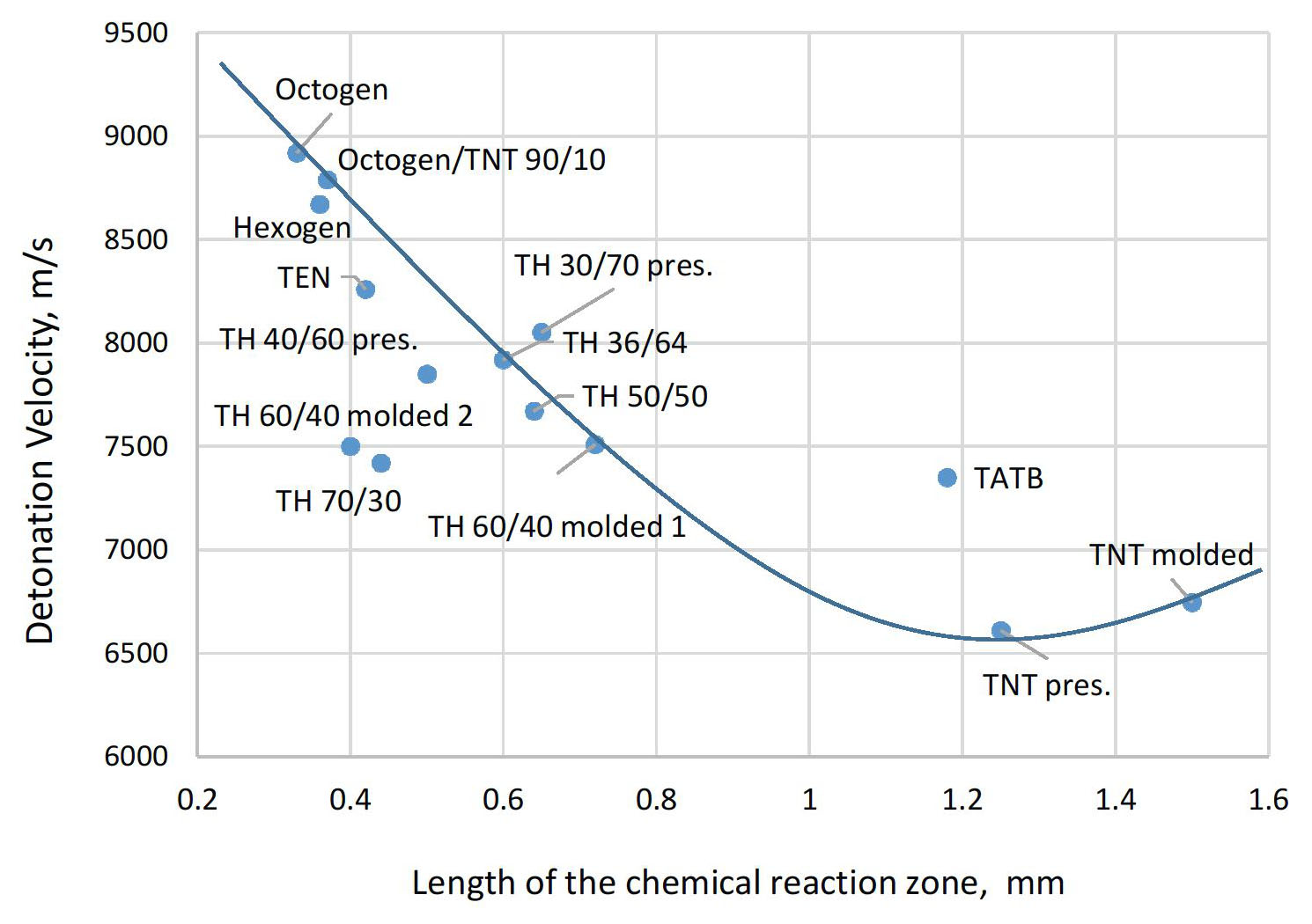 The detonation velocity (m×s–1) correlates with the length of the chemical reaction zone by the equation D = 1000 L2 – 2500L + 9400.