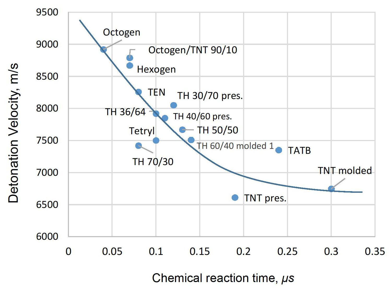 The chemical reaction time is related to the detonation velocity t = 0.075 + 84/(D – 5600).