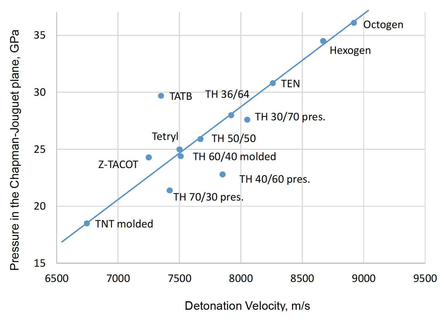 The equation (Fig. 7) of the best linear approximation (excluding the points of the corresponding TATB, TH 70/30 pres., TH 40/60 pres.) of the dependence of pressure in the Chapman-Jouguet plane, GPa, (P) on detonation velocity, m×s–1 (D) will be