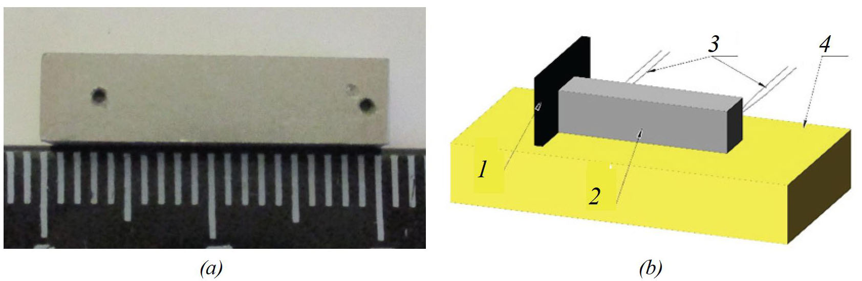 Fig. 1. Combustion rate measurement: a) sample; b) combustion rate measurement scheme: 1 – graphite heater, 2 – sample, 3 – thermocouples BP5/20, 4 – refractory substrate
