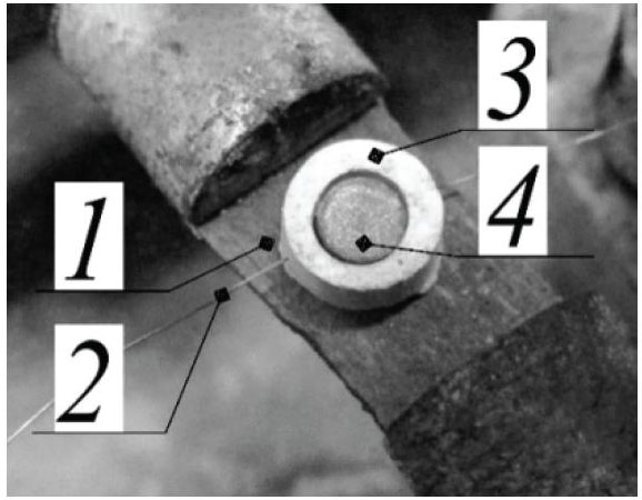 Fig. 2. Measurement of the ignition temperature: 1 – graphite heater; 2 – thermocouple; 3 – boron nitride crucible; 4 – sample