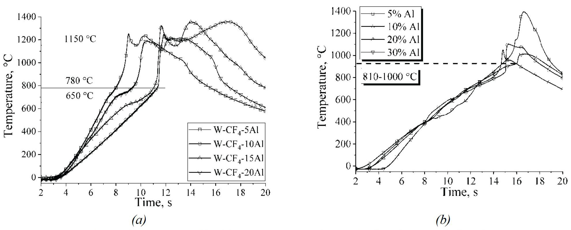 Ignition in the W–CF4–Al-based system began with the melting of aluminum and its interaction with tungsten to a temperature of 1200–1300 °C, regardless of the aluminum content (Fig. 4a). Then, a drop in temperature to 1100–1150 °C was recorded. A further increase in temperature to 1200–1400 °C was associated with the combustion of aluminum with TFM. An increase in the aluminum content increased the rate and duration of the reaction. Ignition of the W-PTFE-Al system began at a temperature of 800–1000 °C, since at this temperature intense evaporation of PTFE and the formation of TFM, which interacted with aluminum, begin (Fig. 4b).