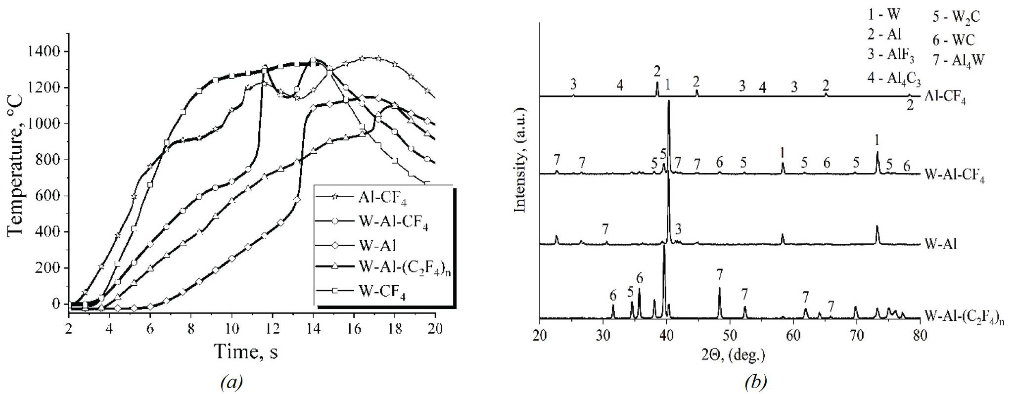 To confirm the above mechanisms and the role of TFM in increasing the ignition intensity, tungsten and aluminum were heated both together and separately (Fig. 5a). When tungsten was heated in TFM, ignition did not occur, and the temperature increased only due to continuous heating. When aluminum was heated in TFM, ignition began at a temperature of 900 °C and reached 1300 °C, and then the temperature dropped to 1100 °C with a subsequent increase to 1300 °C. The main ignition products in the Al–CF4 system were AlF3 and Al4C3 (Fig. 5b). The Al–W and Al–W–CF4 systems ignited at 600–700 °C when heated.
