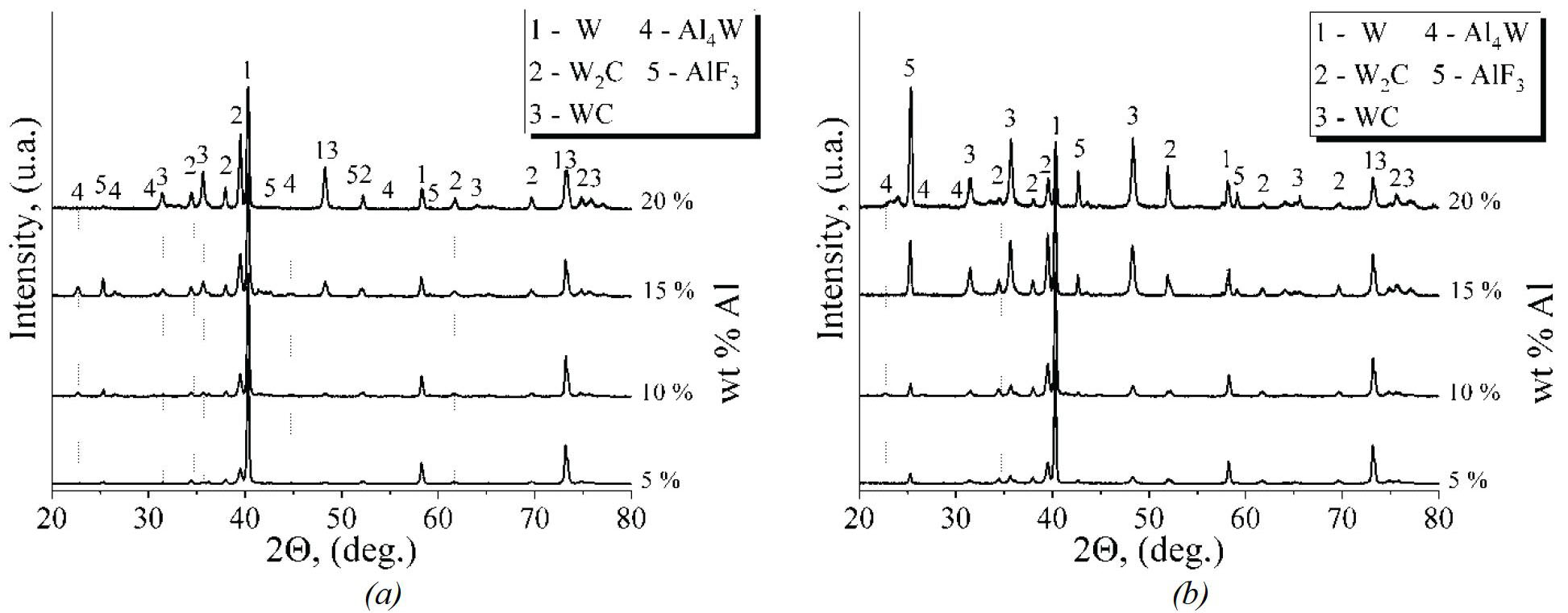 The main product in the mixture without TFM was the intermetallic Al4W, and when TFM was used, tungsten carbides were formed (Fig. 5b). The conducted ignition experiments show that the intense evaporation of PTFE in the W–PTFE–Al system prevents the interaction of tungsten with aluminum. Thus, the interaction of aluminum with TFM provides enough heat to form tungsten carbides and aluminides.
