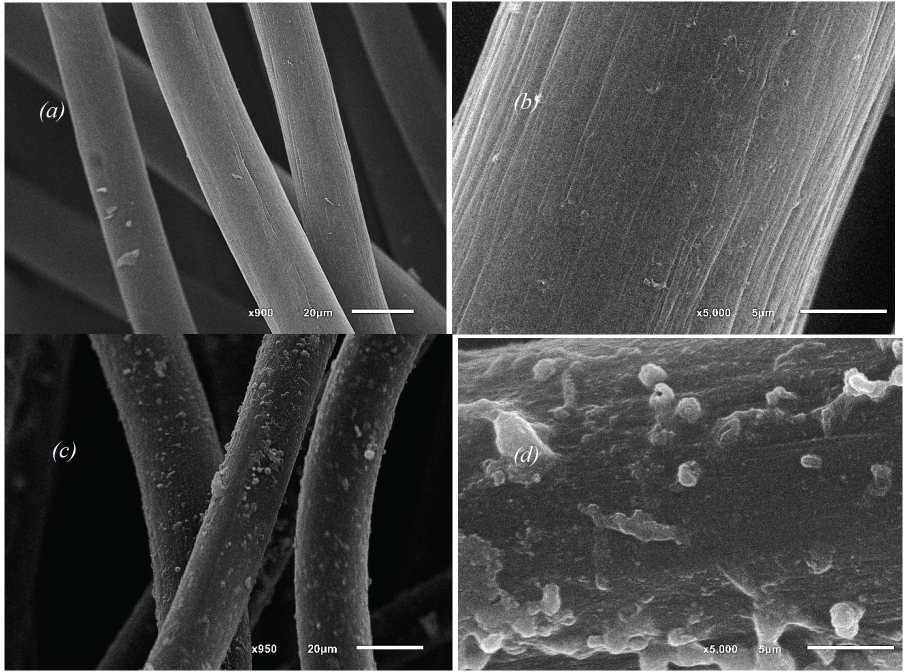 Fig. 1. SEM images of carbon felt samples No. 1 (a, b) and No. 2 (c, d)