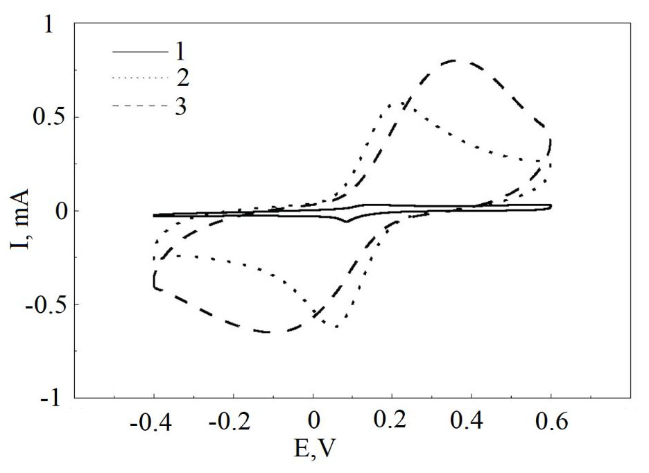 The surface area was determined by the adsorption of methylene blue (solution concentration 1 mmol×dm–3) according to the procedure [6] using an SF-2000 spectrophotometer (OKB-Spectr, Russia). The optical density of the dye was measured at a wavelength of 616 nm. The surface area was determined by nitrogen adsorption using a Quantochrome Autosorb IQ Nova 1200e specific surface area and porosity analyzer (Quantachrome Instruments, USA) at a temperature of 77 K and a partial pressure of 0.05 – 0.30. Electrochemical measurements were performed on a CORRTEST CS1350 potentiostat-galvanostat (Corrtesr, China) in a three-electrode cell with a saturated silver chloride electrode as the reference electrode and a 0.5x0.5x0.1 cm platinum foil as the auxiliary electrode. A 0.1 M KCl solution was used as the background electrolyte. The concentration of potassium hexacyanoferrate (III) in the solution was 0.5 mM. Cyclic voltammograms were recorded at scan rates of 10–500 mV×s–1 in the range of –0.4–+0.6 V.