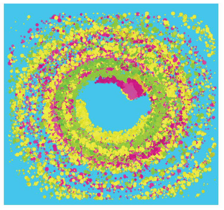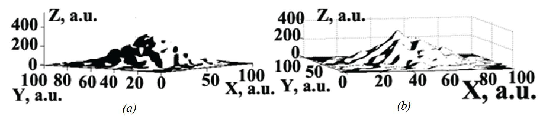 Figure 5 shows model qualitative images of a system of fractal/dendritic nanoclusters in Cartesian coordinates in a.u., deposited from a colloidal solution onto a solid substrate. They were formed within the framework of the DLA model, where a horizontal plane (x, y) was chosen as the seed structure, and the value of s was set to 1 (Fig. 5a). The case was also considered where the variable value of s depended on the current maximum height h of the forming structure, as shown in the figure (Fig. 5b). This value increases to the required maximum height h = H (see Fig. 6). In this model, we assume that s = h/H, so that over time, the value of s increases from 0 (h = 0) to 1 (h = H).