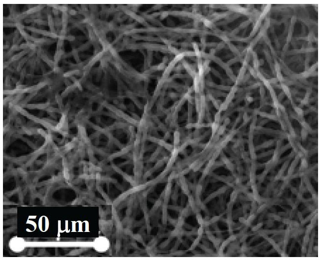 One convenient method for synthesizing carbon nanofibers is by exposing the medium to laser radiation in the presence of an external electric field. Using this method, as described in [48], we obtained carbon nanofibers deposited on a metal plate (Fig. 8). The structure of the synthesized samples indicates the controllability of the topological characteristics of nano-objects by selecting appropriate experimental parameters: laser radiation characteristics and the intensity of the externally applied electric field. For instance, Figure 8 shows a sample nanofiber structure at various specified external voltages.