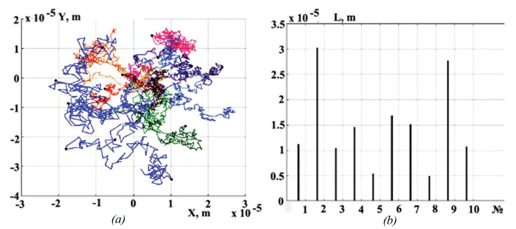 Switching to absolute units allowed for a comparison between the model and experimental results in terms of assessing the local lengths of the simulated fractal nanostructures. By setting the side length of the computational cell in the model to 10 nm, the maximum length of the nanowires was found to be between 3000 and 3900 nm in the case of equal-probability displacements. This may correspond to the generation of nanowires in the presence of a weak external electric field. The range of maximum lengths, from 3000 to 3400 nm, in the case of small lateral displacements is characteristic of nanowires generated under a stronger electric field.