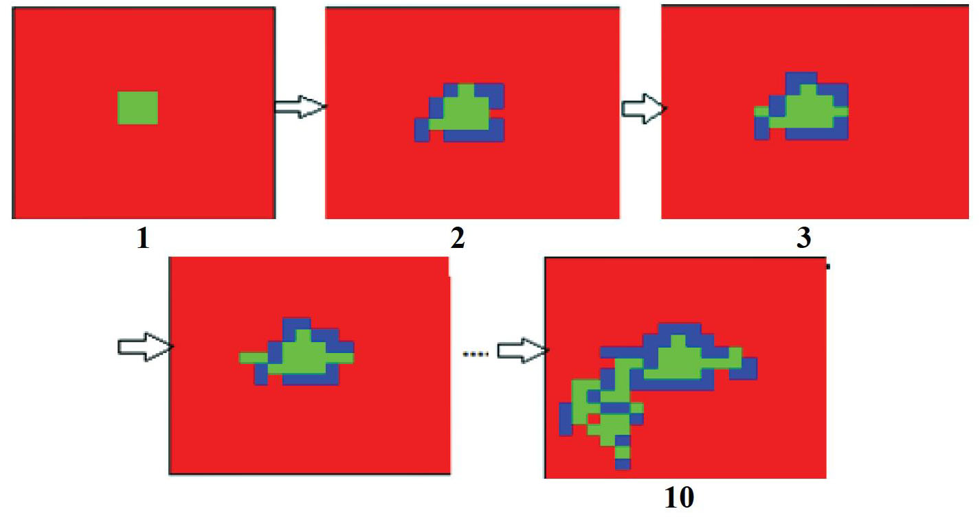 In general, the algorithm for forming DLA structures is implemented as Brownian motion of a particle within a computational domain containing a seed structure, followed by aggregation/attachment with a given probability. Various modifications of the general DLA case allow for the consideration of thermal processes occurring during aggregation in colloidal systems. The DLA model and its transformation, taking into account additional factors, can be implemented using cellular automata techniques with von Neumann and/or Moore neighborhoods [44]. For instance, using the von Neumann neighborhood allows for the creation of samples with a heterogeneous structure, while the Moore neighborhood produces well-filled, homogeneous samples (see more details in the Appendix).