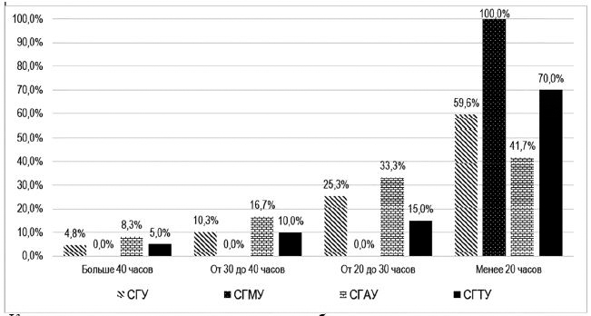 8,3 %, а в СГУ и СГТУ – 4,8 % и 5,0 % соответственно. В диапазоне от 30 до 40 часов студенты из СГАУ (16,7 %) более активны, чем в других вузах. Значительный процент студентов работает от 20 до 30 часов в неделю: в СГАУ это 33,3 %, а в СГТУ – 15 %. Наиболее распространенная категория – работа менее 20 часов в неделю, особенно в СГМУ, где абсолютное большинство студентов попадает в эту категорию. В СГУ этот процент составляет 59,6 %, а в СГАУ – 41,7 %.