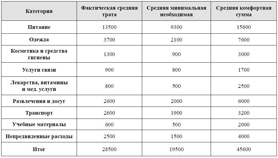 В итоге, общие фактические расходы студентов составляют около 28 500 рублей в месяц. Для минимально необходимого уровня жизни требуется 19 500 рублей, а для комфортной жизни студенты должны тратить до 45 600 рублей в месяц. Если эти данные экстраполировать на год, то: