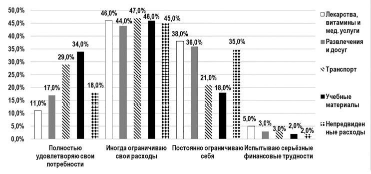 заявили, что им приходится постоянно экономить, что может указывать на недостаточный уровень доходов или высокие цены на одежду. Лишь 2 % испытывают серьёзные финансовые трудности в этой категории, что соответствует общей картине умеренного финансового состояния студентов.