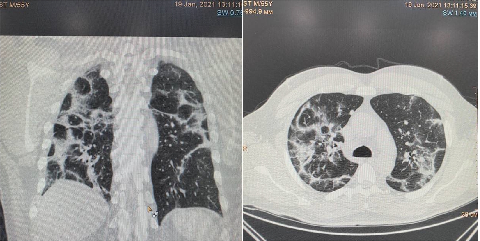 Пациент (мужчина) 55 лет поступил в стационар с жалобами на сухой кашель, нарушения обоняния и вкуса, одышку при нагрузке, ощущение тяжести в грудной клетке, слабость, боли в мышцах и повышение температуры тела до 380 С. Больной обратился за медицинской помощью на 5 сутки после появления симптомов ОРЗ в связи с неэффективностью самостоятельного лечения и появлением одышки. При поступлении по данным МСКТ легких – признаки двусторонней полисегментарной интерстициальной пневмонии с объемом изменений в пределах 20%, КТ-1 (рис.1). Короновирусная инфекция была подтверждена результатами ПЦР. При поступлении состояние было расценено как средне-тяжелое.