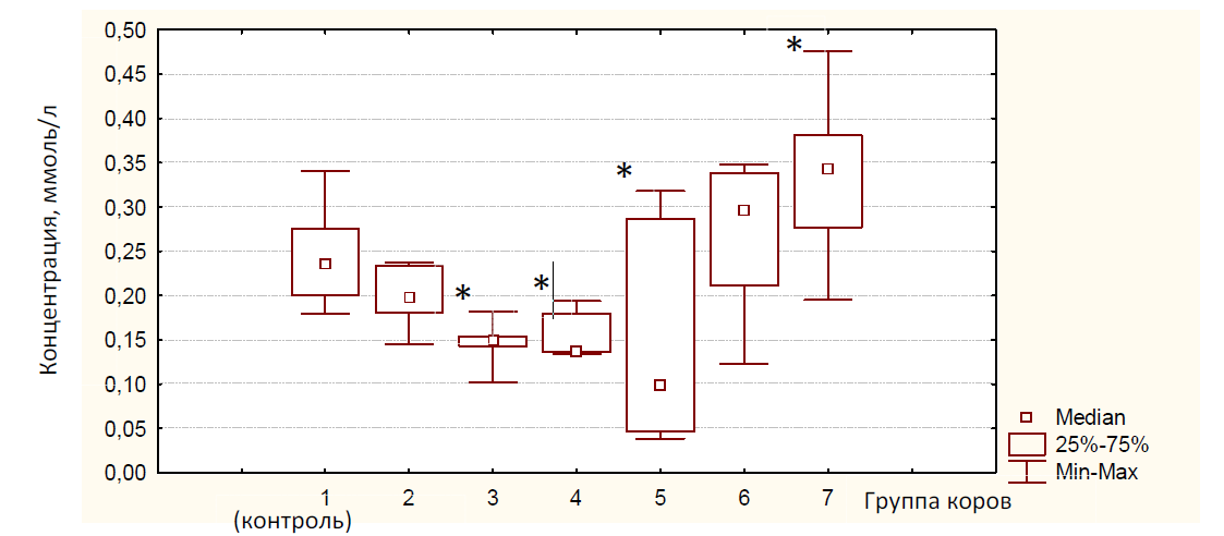 Согласно литературным данным изучения процессов перекисного окисления липидов и состояния антиоксидантной системы у сухостойных и лактирующих коров в динамике предродового и послеродового периодов, показано, что физиологический стресс периода стельности и отела сопровождается повышенным образованием и накоплением продуктов свободнорадикального окисления липидов и низким потенциалом антиоксидантной системы [5].