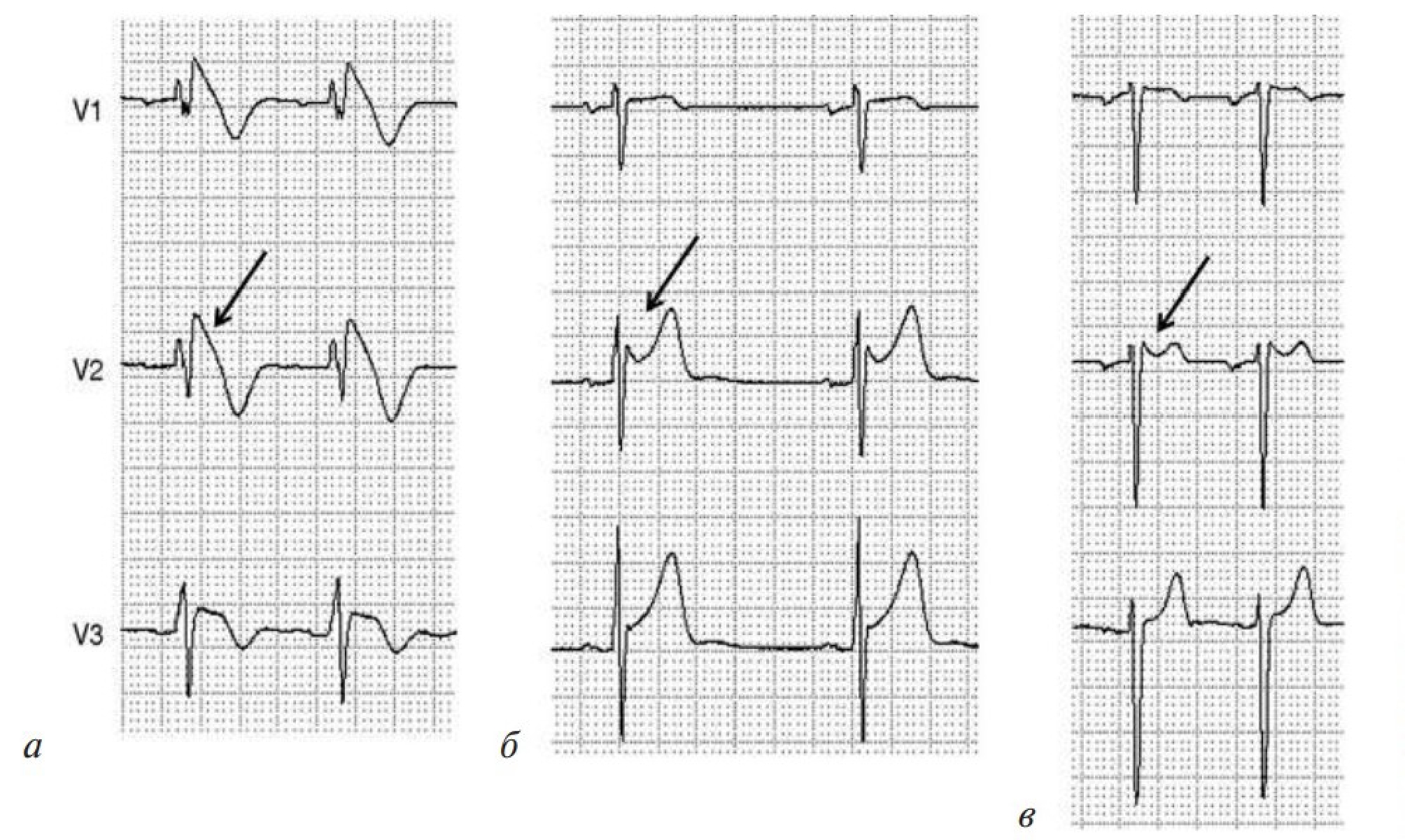 Рисунок 1. ЭКГ паттерны синдрома Бругада (а – элевация сегмента ST 1 типа "сводчатой формы", б – элевация 2 типа "седловидной формы", в – элевация 3 типа формы, близкой к "седловидной") [7].