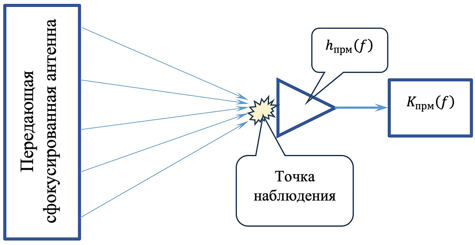 Заметим, что в общем случае может оказаться нецелесообразно разделение на свойства сфокусированных широкополосных антенн в режиме приема и передачи, а можно переходить непосредственно к введению представления радиолинии содержащей передающую и приемную части, характеризуемые параметрами передающей антенны, среды распространения и приемной части, содержащей приемную антенну и тракт обработки, характеризуемые спектром передаваемого сигнала, частотной характеристикой среды и параметрами линейного приемника.