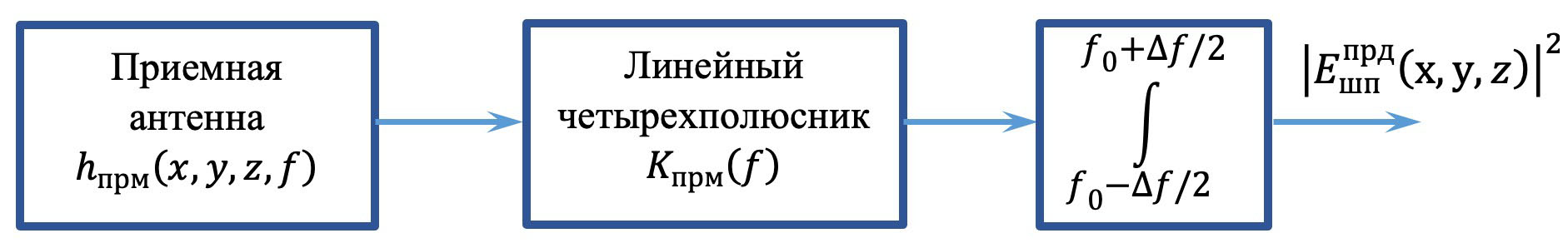 Во-вторых, речь может идти о случае, когда в точке с координатами расположено приемное устройство и, следовательно, характеристикой пространственного распределения является величина мощности «принимаемого» сигнала. Иллюстрирующая структурная схема приемной части приведена на рис. 2.