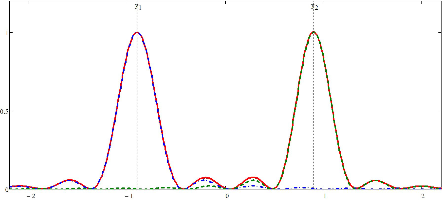 На рисунке 2 представлено распределение энергии электромагнитного поля по поперечной координате вдоль оси, проходящей через обе точки фокусировки и параллельной линейной дискретной антенне, где отчетливо видны два максимума энергии поля в точках фокусировки F1 и F2, расположенные симметрично относительно оси 0Х; синим и зеленым цветами обозначены распределения энергии электромагнитного поля на частотах f1 и f2, соответственно, а красным — суммарное распределение энергии поля в заданной области.