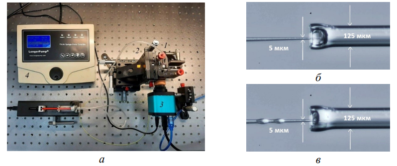 Для контролируемого ввода ЖК в рабочую полость использовалась установка, фото которой приведено на рис. 1. Микрокапилляр 1 Femtotip Eppendorf (Германия) внешним диаметром 2 мкм фиксировался в держателе трехосного позиционера 2. Напротив капилляра располагался торец оптического волокна. С помощью позиционера под контролем видеокамеры 3 осуществлялась настройка соосности элементов. После юстировки кончик капилляра вводился в полость (рис. 1б) и с помощью шприцевого насоса 4 LongerPump TS-2A (UK) осуществлялось заполнение каверны ЖК заданного объема (рис. 1в).