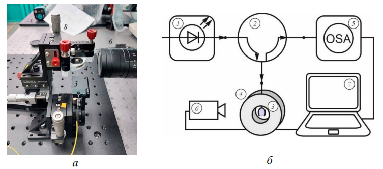 Рис. 2. Фото установки (а); оптическая схема установки по тестированию чувствительного элемента амплитудного датчика электромагнитных полей: 1 – источник лазерного излучения, 2 – циркулятор, 3 – полость, заполненная ЖК, 4 – кольцевые магниты, 5 – оптический спектроанализатор, 6 – видеокамера, 7 – ПК, 8 – трехосный позиционер (б)