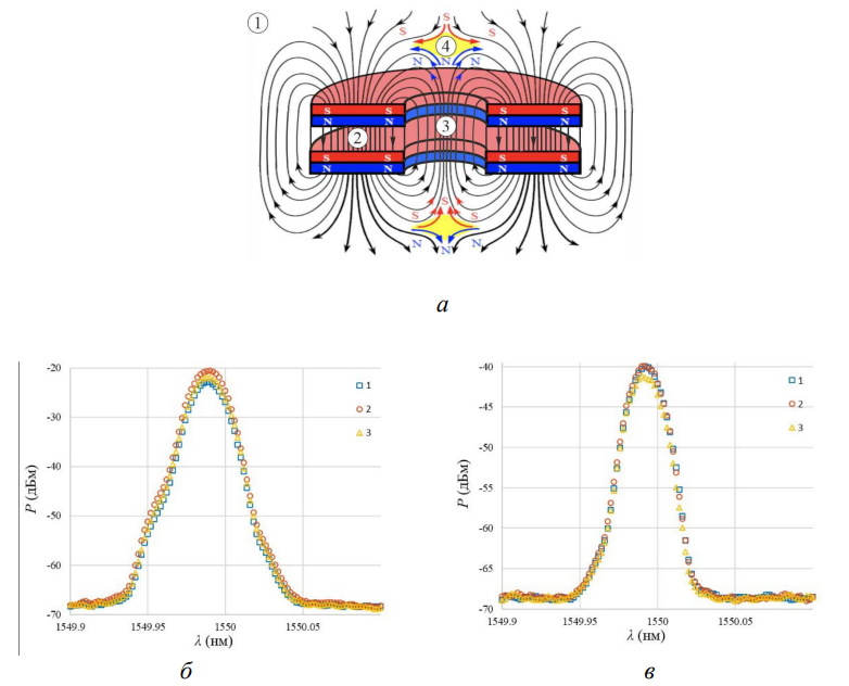 В ходе эксперимента в работе были измерены значения мощности отраженного сигнала (рис. 3б) для трех положений полости относительно системы постоянных магнитов: 1 – в области с Н1= 0 А/м, в точке 2, где Н2 имело значение 191 кА/м, и точке 3 с Н3= 159 кА/м (рис. 3а). Точка 4 с аномально низким значением Н4=29,5 кА/м в экспериментах не рассматривалась. Графики Р(λ) для чувствительных элементов с диаметрами устья 68 и 125 мкм приведены на рис. 3б и рис. 3в соответственно.