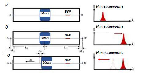 ВБР фиксировалась с помощью инерционного блока (масса) в алюминиевой полости. Блок представлял собой симметричный цилиндр, который мог свободно колебаться внутри полости и формировать различное натяжение ВБР. На рис. 1,в показана диаграмма расположения центральной длины волны ВБР, когда структура блока подвергается осевой вибрации, что приводит к ее сдвигу влево. Волокно фиксировали сначала в точках А до В полости (рис. 1,а), а после предварительного натяжения удлиняли до точек А’ до В’ (рис. 1,б) для перевода в рабочий режим с отсутствием провисания волокна (рабочая точка). При любом ускорении а волокно будет натянутым без провисания, а центральная длина волны ВБР будет перемещаться пропорционально натяжению и его направлению.