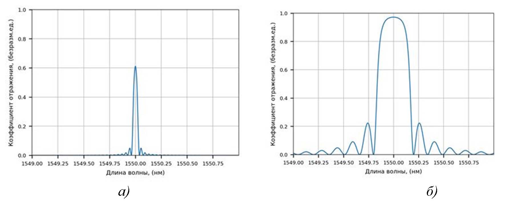 Рис. 1. Спектры отражения однородной ВБР, построенные методом матриц передачи: а) высокодобротный, б) низкодобротный