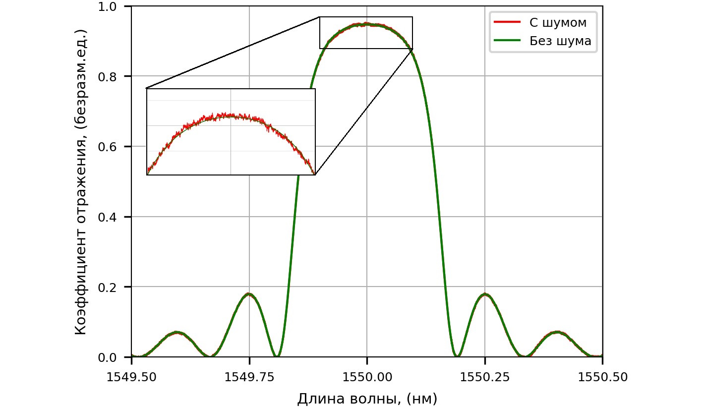 Включение шума в моделирование позволяет получить более точное представление о реальных спектральных характеристиках отражения и пропускания ВБР, учитывая реальные возмущения. Это особенно важно при проектировании высокоточных сенсоров и фильтров, где даже незначительные изменения спектра могут существенно повлиять на рабочие характеристики устройства. Следует отметить, что часто используемый «белый» шум, тут не вполне адекватно отражает реальные процессы, поскольку амплитуды высокочастотных шумовых компонент всегда ниже, чем высокочастотный шум. Учет шума способствует повышению достоверности численных расчетов и оптимизации параметров ВБР для конкретных приложений. Пример спектра ВБР с шумом и без шума приведен на рисунке 2.