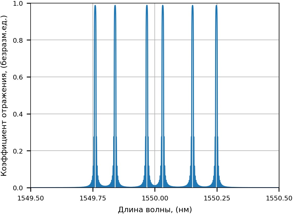Пример построения спектра отражения ВБР с использованием предложенного метода матриц передач, приведен на рисунке 1.