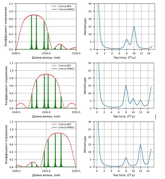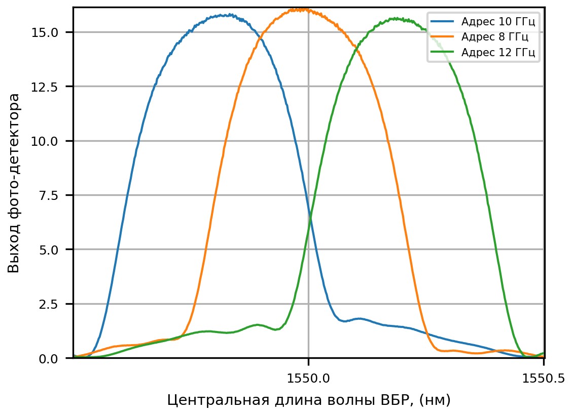Пример спектрального отклика МАВБС, состоящий из трех адресных структур, с адресными частотами 10, 8, 12 ГГц, и центральными длинами волн 1549.8 нм, 1550.0 нм, 1550.2 нм, приведен на рисунке 3.