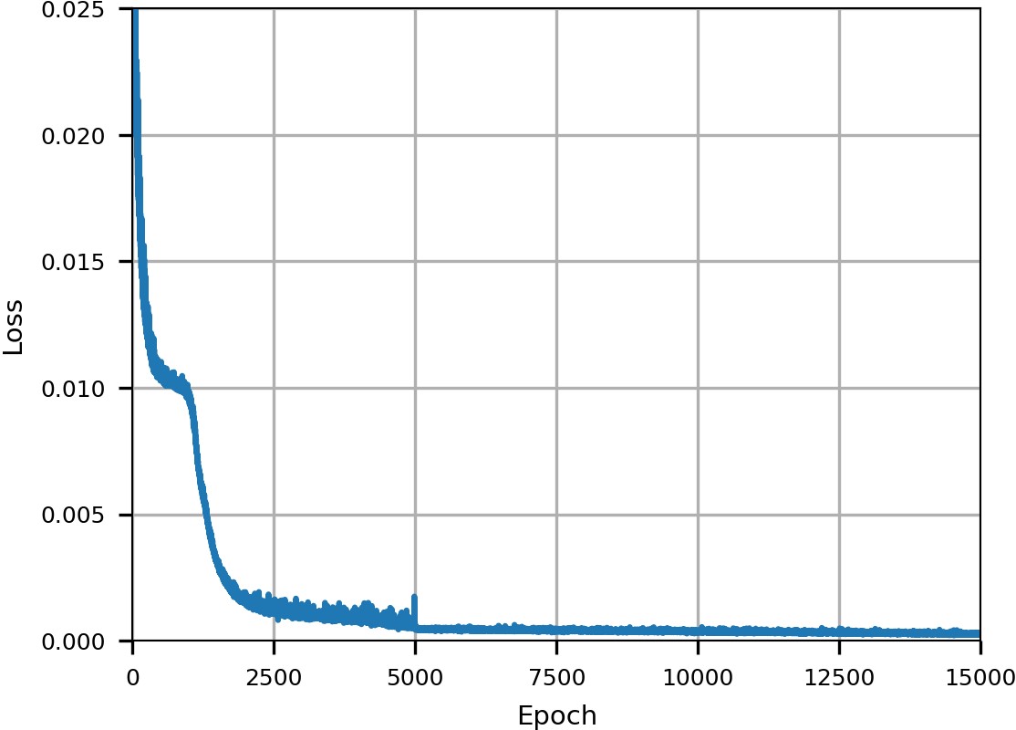 Была произведена дополнительная настройка параметров модели. Модель обучалась на 5000 итераций с коэффициентом обучения 0.001 и 10 000 итераций с коэффициентом обучения 0.0001. В результате этого, средняя абсолютная ошибка определения центральной длины волны снизилась и составила 0.001 нм. График функции потерь в процессе обучения модели приведен на рисунке 7.