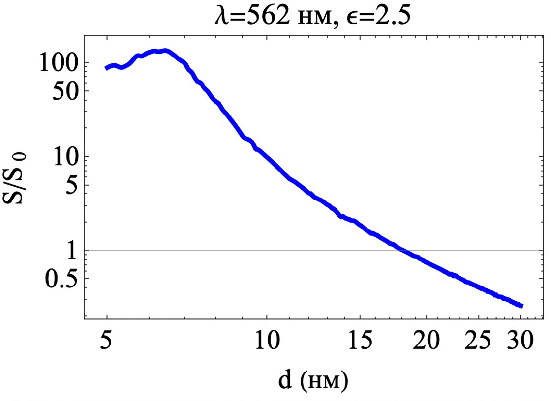 Рис. 5. Усиление излучения S/S0 диполя, расположенного в верхней части серебряной шляпки на расстоянии 1 нм от нее в зависимости от толщины серебра. Шляпка покрывает половину площади пластиковой сферы