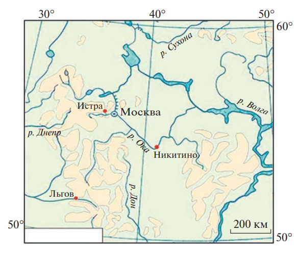Рис. 1. Расположение объектов исследования в пределах центра Европейской части России: Льгов – на р. Сейм, Никитино – на р. Оке, Скит Никона – на р. Истре. Fig. 1 . Location of studied sites within the center of the European part of Russia: Lgov – the Seim River, Nikitino – the Oka River, Nikon Skete – the Istra River.