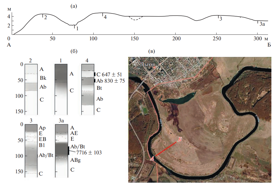 Рис. 2. Топографический профиль (A–Б) на пойме р. Сейм с расположением разрезов (а); строение разрезов (б) и вид на участок долины р. Сейм (в). 1 – номера разрезов; 647 ± 51 – возраст отложений. Fig. 2 . Topographic profile (A–Б) on the floodplain of the Seim River and location of soil pits (а); stratigraphy of soil profiles (б) and a view of the segment of the Seim River valley (в). 1 – numbers of pits; 647 ± 51 – age of deposits.