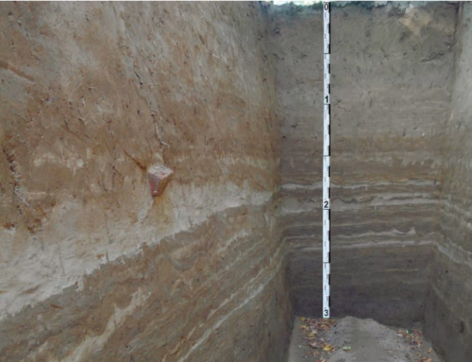 Рис. 3. Разрез Скит Никона, пойма р. Истры. Внизу, на глубине 270–300 см залегает почва времени строительства Скита Никона, на глубине170 см – кирпич и другие артефакты середины XVIII в. В средней части изученной толщи, 135–235 см, залегает грубослоистый аллювий, накапливавшийся с высокой скоростью. Fig. 3 . Soil pit at floodplain of the Istra River, the Nikon Skete site. Below at a depth of 270–300 cm lies the paleosoil which was formed during the time of the Skete construction is identified at the depth of 270–300 cm bricks and other artifacts of the middle of the XVIII century were found at a depth of 170 cm; coarse-layered alluvium, characterized the stagewith high rate of floodplain sedimentation occupied the middle part of soil section, 135–235 cm.